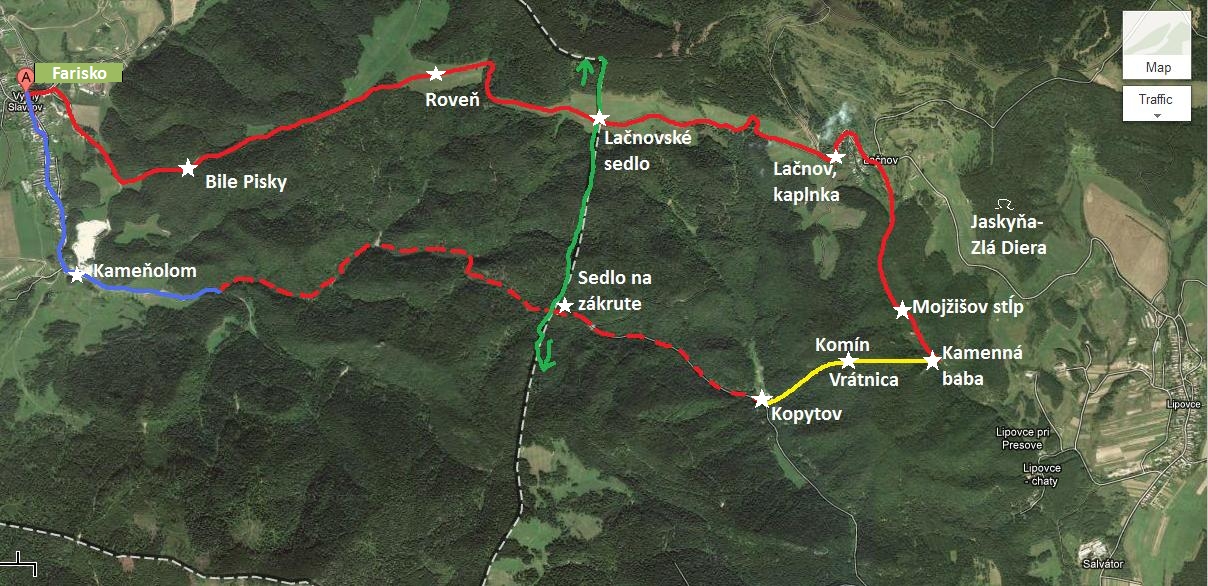 Trasa: Farisko – Charita – Bile Pisky – Roveň – Lačnovské sedlo – Lačnov-kaplnka – Kamenná baba – Vrátnica – Kopytov – Sedlo na zákrute – Kameňolom – Farisko